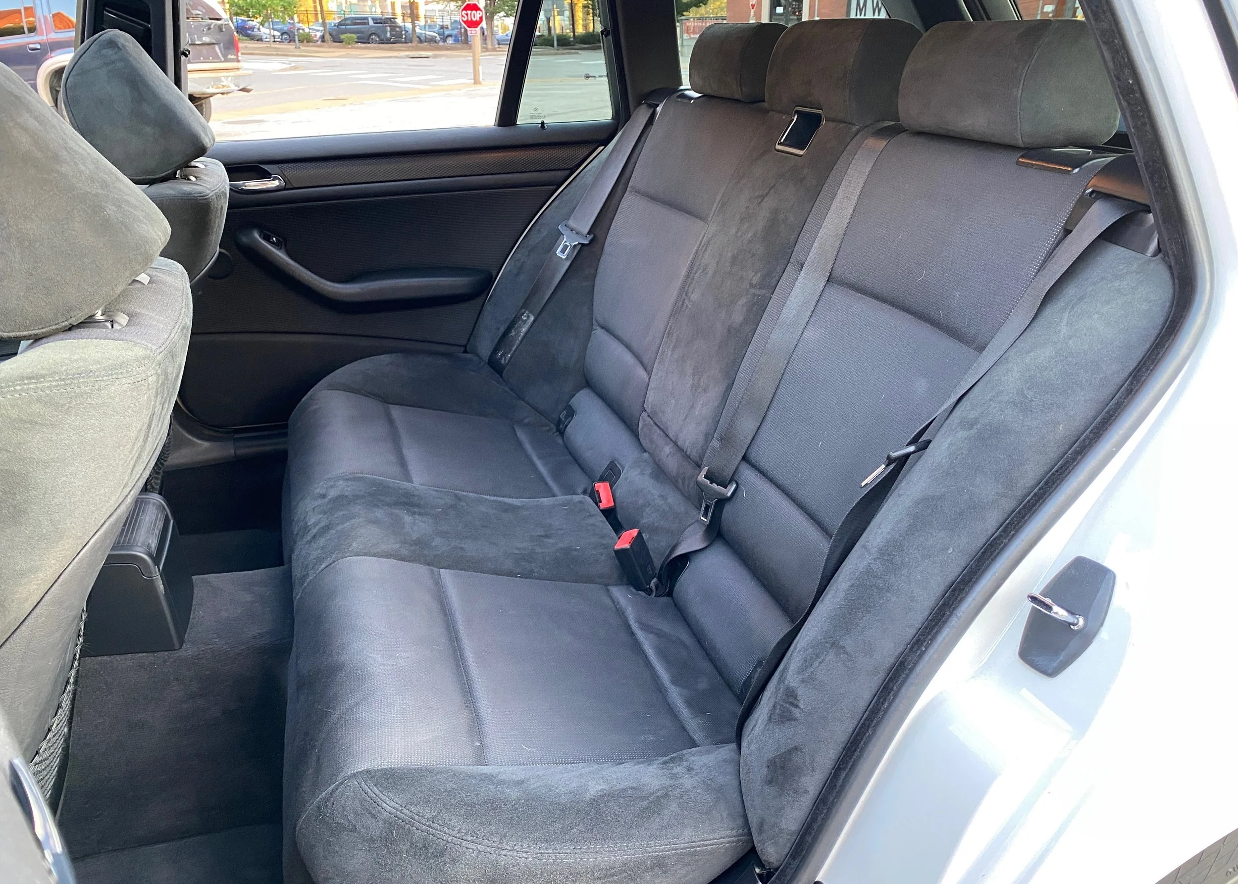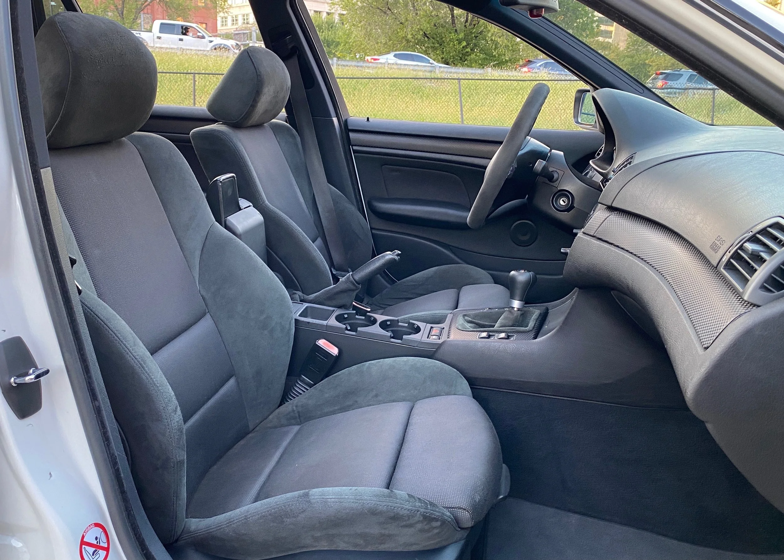 Upon receiving the car, we swap in a 6-speed ZHP transmission; over the next few years, we proceeded to swap out the beige interior and install ZHP-specific cloth/alcantara interior parts - seats, door panels, carpet, trim pieces, kick panels, door trim, hatch trim, dead pedal, A, B & C pillars, headliner etc. We mostly used new OEM parts ordered from BMW, although in a few instances we installed used parts, for example the seats….including the rears, which we sourced from a seller in Europe.